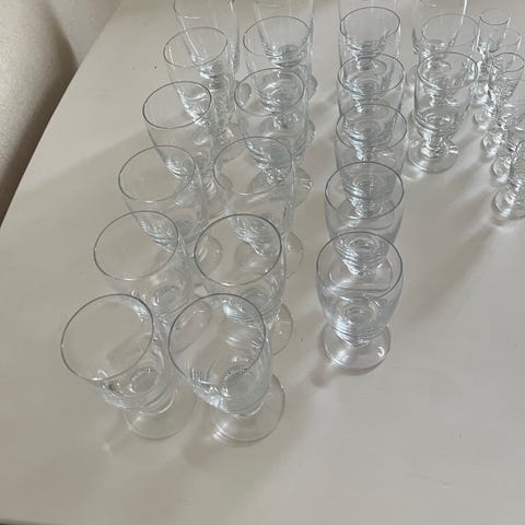Holmegaard glas sæt i både grøn og klar glas. Sættet omfatter forskellige typer glas på stilk samt drikkeglas uden stilk. Glassene har samme facetterede designudtryk og kan anvendes til fx vand, vin eller andre drikke. Velegnet som samlet servicesæt til borddækning, hvor der ønskes ensartede glas i både farvet og klart glas.