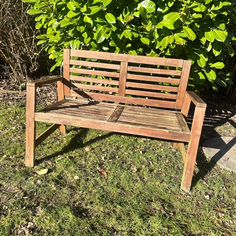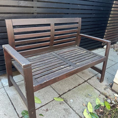Havebænk buet træ med blå hynde
