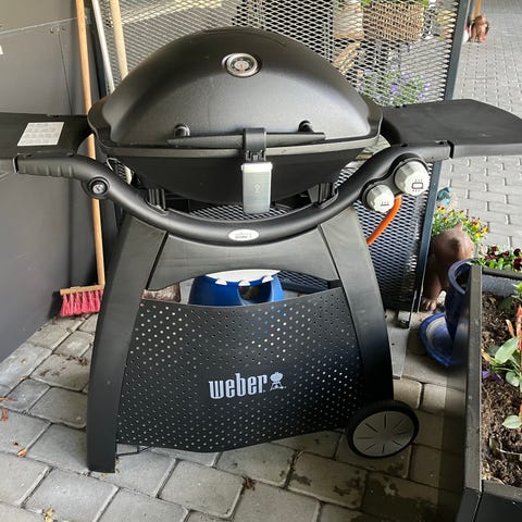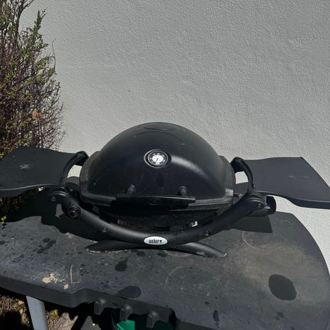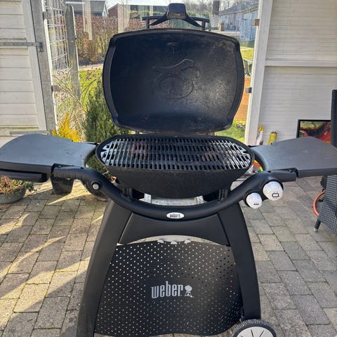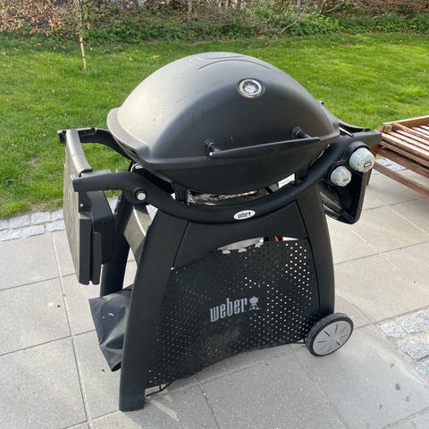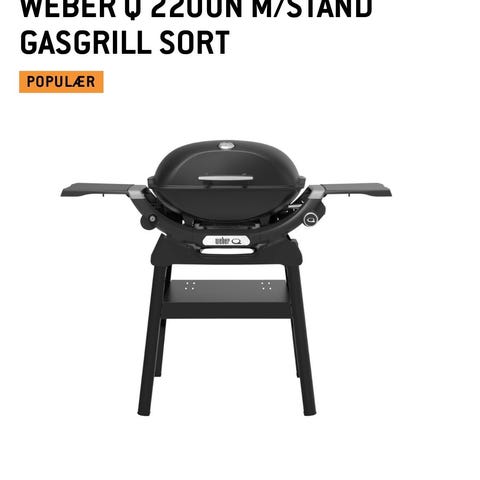 Weber Q gasgrill med stativ og tilhørende grillovertræk.