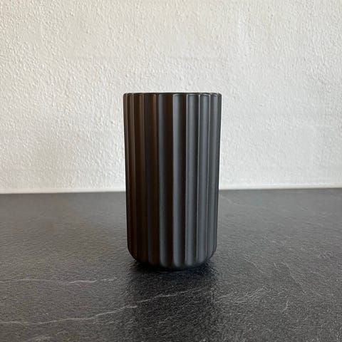 Mat sort riflet Lyngby vase måler 25 cm i højden og 14 cm i diameter.