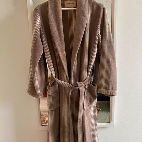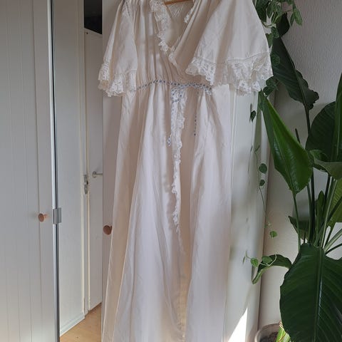 Vintage morgenkåbe med blomster. Der står den er størrelse 44, men da det er ældre mål, er den nok lidt lille i størrelsen. Har brugsspor, den har nogle svage pletter foran som ikke er forsøgt fjernet, et mindre hul og en rift ved hægten (se de tre sidste billeder).
