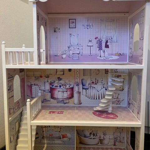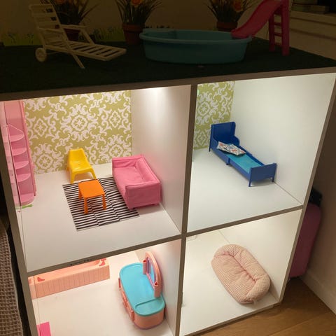 Stort hjemmelavet Barbiehus med indbygget opbevaring til barbiedukker, tøj og småting. Derudover er der 8 LED spots, som kører på strøm, så der er ikke noget med batterier, der løber tør.