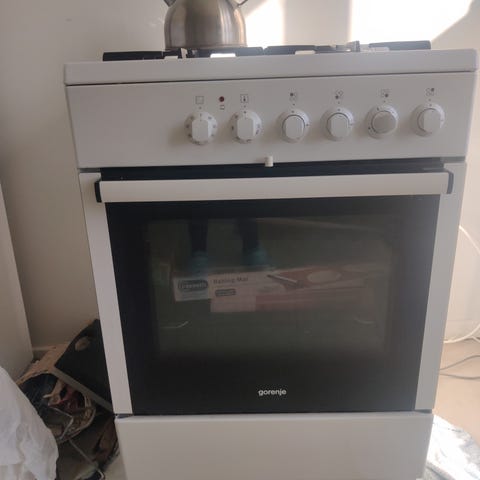 Gorenje komfur med gasblus og elovn. Ovnen har mange funktioner (varmluft, almindelig varme, grill, optøning mm.)