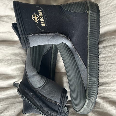 Hiko sport neopren dykkerstøvler og handsker i sort. Sættet består af et par neoprenstøvler med skridsikker gummisål og velcrolukning over vristen samt et par neoprenhandsker med velcrolukning ved håndleddet. Begge dele er velegnet til dykning, snorkling eller vinterbadning, hvor der ønskes isolering og beskyttelse af fødder og hænder i koldt vand. Støvler str. 37-38, handsker str. S/M. Kan også købes enkeltvis til 75 kr.