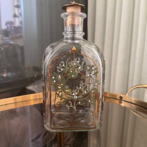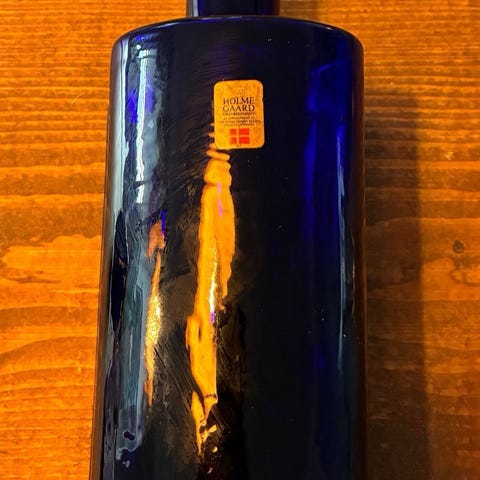 Holmegaard Stramon art glasflaske i grønligt glas. Flasken har rund, bred bund og lang, smal hals med korkprop. På forsiden ses trykt tekst med "Stramon art". Velegnet som dekorativ flaske, vase eller samlerobjekt i glasindretning.