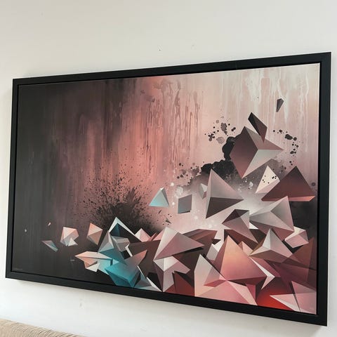 Kompositionen er indrammet i en enkel aluminiumsramme med glas, som fremhæver værkets grafiske udtryk og gør det klar til ophæng.