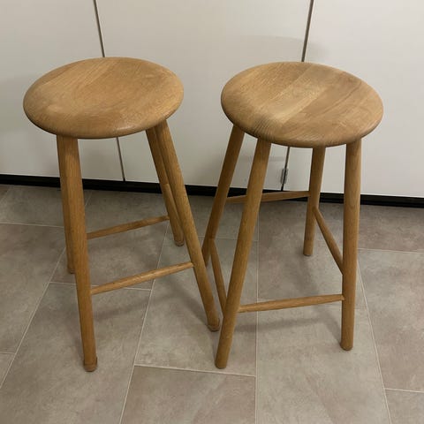 To styk barstole fra Findahl Buck i Hammel. Eg/hvidolie med sort læder.