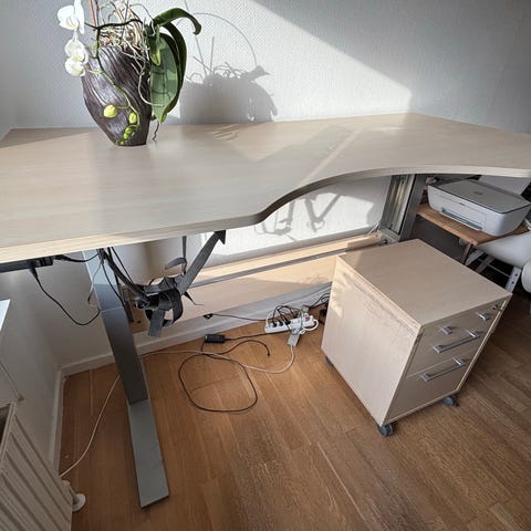 Fint hvidt manuelt hæve/sænke skrivebord fra ikea. 120x70cm. Højde justerbart 72-122cm. Det hæves eller sænkes på håndtaget til højre under bordpladen.