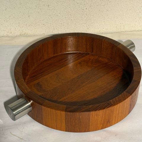 Kartoffelskål, serveringsfade salt og peber sæt i rustfrit stål med palisander håndtag fra 60erne.