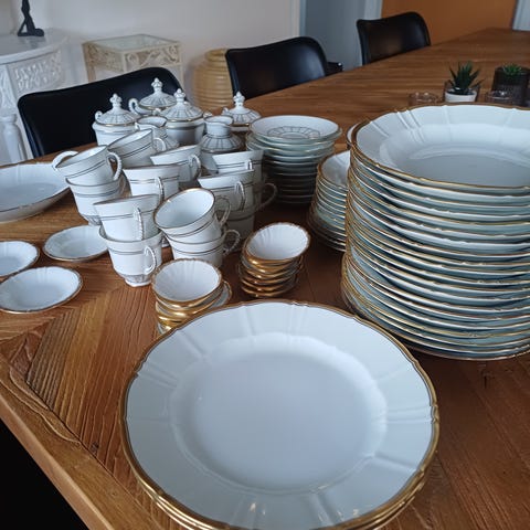 7 smukke og fejlfri Offenbach tallerkener med guldkant. 21 cm i diameter. Tallerkenerne passer godt til en portion suppe eller en dessert. Tallerkenerne er i flot stand og fremstår helt uden brugsspor - kun er der en meget lille ridse i en tallerken. Fem tallerkener har nr. 23 og to har et F i bunden, og alle er i samme størrelse.