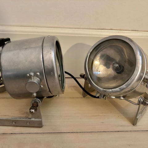 Projektør, Tilley, Gammel projektør fra Civil Forsvaret. Tilley. Ombygget til 230 volt. Monteret på stort originalt stativ og med lysdæmper. Originale dele fra ombygning følger med.