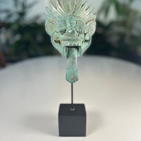 Smuk og detaljeret Barong-inspireret figur i bronze med flot grønlig patina, monteret på sort fod.
