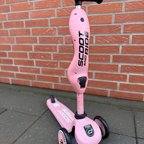 Scoot and Ride løbehjul i pink. Model med tre hjul for øget stabilitet og styr med håndtag. Egnet til mindre børn, som kan stå op og køre på løbehjulet. Plast- og metaldele med gummihjul, der giver godt vejgreb på faste underlag. Velegnet til udendørs brug på fx fortov, gård eller havegang.