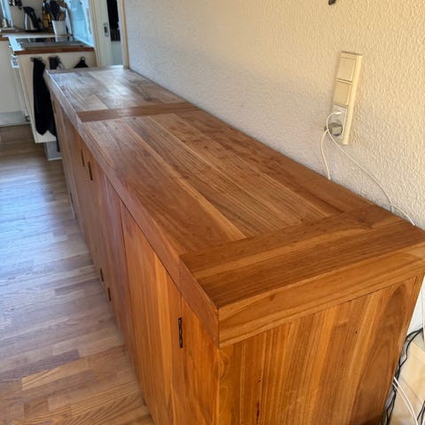 Smuk og kompakt teak skænk med varme trætoner og et tidløst mid-century look. Skænken er nænsomt slebet og olieret, så træets naturlige glød virkelig kommer frem — klar til brug med det samme.
