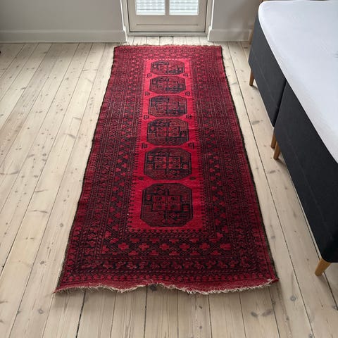 Måtte. Formoder det er ægte tæppe. Enderne er for hårdt knyttet så fornen vender opad i hjørnerne. Obs dette. Mål er taget af selve tæppe uden knytning.