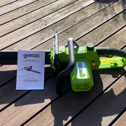 AL-KO kædesav, elektrisk model i rød og grå. Savens krop er udført i plast med integreret håndtag foran og bagpå for bedre kontrol under brug. Kædesaven har kædeskinne med kædebeskyttelse, kædestramning via stort drejehjul på siden samt sikkerhedsbøjle foran. Velegnet til almindelige saveopgaver i have og på mindre træarbejde, hvor der er adgang til strøm. Kædesaven kun brugt 1 gang til beskæring af ligusterhæk.