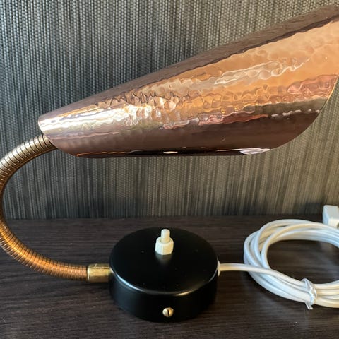 2 stk. væglamper 1950´erne – Fog og Mørup. Massivt kobber, som er istandsatte og poleret op, messing flexarme, teaktræ vægstykker, som er intakte. Efterhånden sjældne!