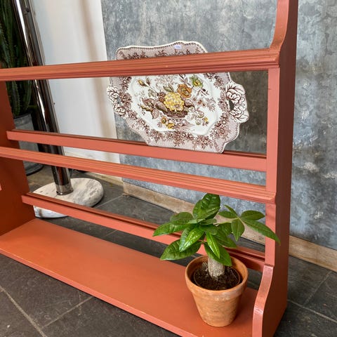 Gammel fin tallerkenrække malet i en skøn pistacie grøn farve, der giver et let og forårsfriskt udtryk.