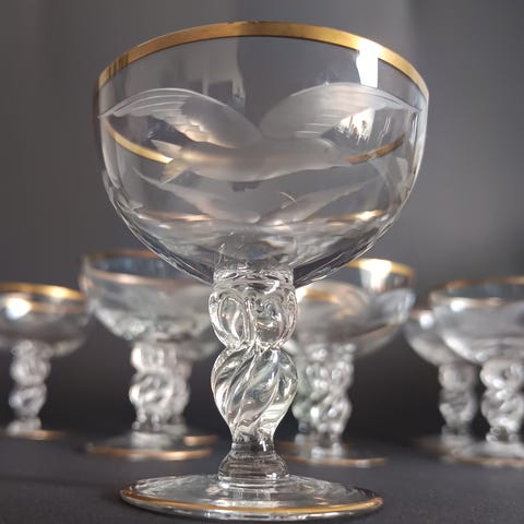 Glasserien Lyngby Måge blev lavet i 2 varianter, En med graverede måger, og en uden graveringer, Disse 6 glas er med graveringer.