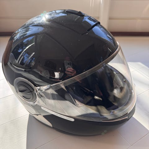Schuberth C3 motorcykel klaphjelm i størrelse 58/59 (L). Hjelmen er i neongul farve med Europa kortgrafik på yderskallen. Indersiden har polstrede puder og foret inderhjelm for komfort.