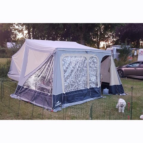 Super fin Camp-let, synet 13-2-2025 og fik nye fælge og dæk ved syn. Den er med køkken og gasblus, samt vask/vandhane. Den er pæn i både sovekabiler og lugter IKKE af fugt. Har stået inde altid efter brug. Der er 2 små reperationer på telt dug som kan ses. Den er komplet og lige klar til ny familie. Der medfølger cykelstativ til 3 cykler samt div udstyr.