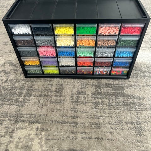 Perler Hama med perleplade sæt lige til at gå i gang ny pakke indholdet 1 stk. plade og 450 perle i forskellige farve, kan hente for 25 kr. per æske. sendes gerne