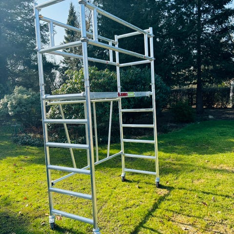 Konstruktionen er udfort i letvægts aluminium, som gor stilladset nemt at flytte rundt pa arbejdsstedet.