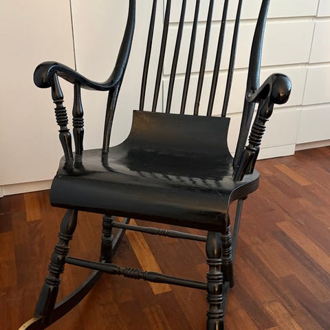 Gyngestol i træ med sæde og ryg i flet. Stolen har buede armlæn og traditionelle meder, der giver en klassisk gyngefunktion. Træet fremstår i en mørk finish, mens fletværket har en lys naturfarve. Velegnet som læse- eller hvilestol i stue, værelse eller udestue.