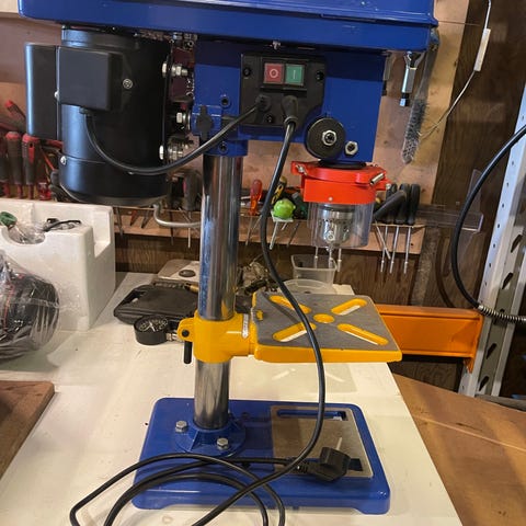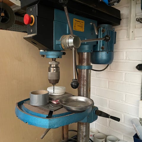 Krenn søjleboremaskine med monteret skruestik. Maskinen er gulvmodel med højdejusterbart bord og håndsving til justering. Velegnet til præcisionsboring i metal og andre materialer i værksted eller hobbybrug. Billederne viser desuden tilhørende slibemaskiner og anden værkstedsindretning, som eventuelt kan indgå efter aftale, hvis det er relevant for køber. gi evt. et bud