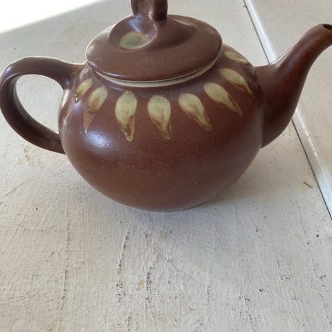 Flot, brun, retro tekande i keramik med flettet hank og låg. Kanden fejler intet udover et afslag ved tiden.