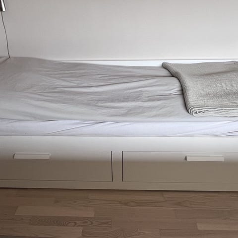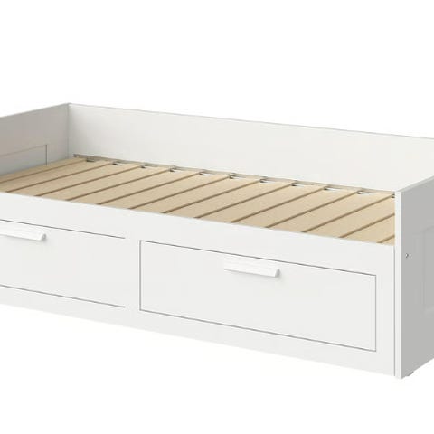 IKEA BRIMNES sovesofa med 2 skuffer i hvid. Sengestel i enkeltstørrelse 80x200 cm med opbevaringsskuffer under liggefladen. Egnet som enkeltmandsseng eller sovesofa i stue, gæsteværelse eller børneværelse. Hvidt træstel med greb på skufferne for nem adgang til opbevaring af sengetøj eller lignende. Leveres med madras som vist på billederne, mål ca. 80x200 cm.