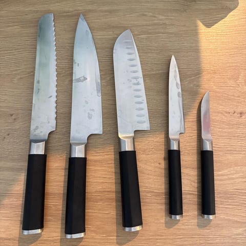 Raadvad knivsæt med knivblok i sort træ og knive i rustfrit stål. Sættet indeholder fem forskellige køkkenknive, herunder mindre urtekniv, mellemstor allroundkniv, santokukniv, større kokkekniv og brødkniv med bølget klinge. Knivblokken har flere slidser til organisering og opbevaring af knivene på køkkenbordet. Velegnet til almindelige køkkenopgaver som snitning, hakning og skæring af brød og grøntsager.