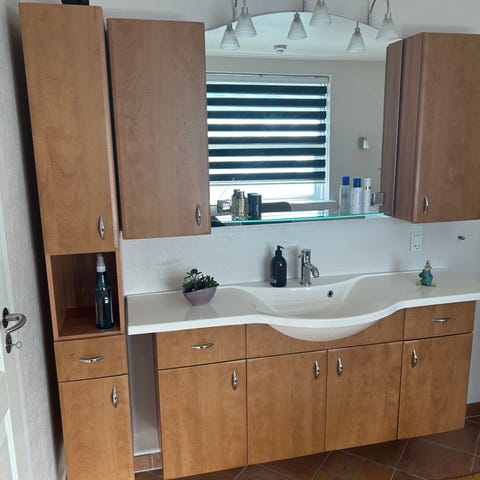 Underskabe med bordplade og håndvask. Med spejl og 2 overskabe. Er fra 00'erne.