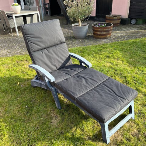 Liggestol til udendørs brug med grå metalramme og buede armlæn. Stolen har blå, polstret hynde, der dækker hele liggefladen og ryglænet. Liggestolen er udstyret med hjul bagtil, så den kan flyttes rundt på terrassen eller i haven. Rammen viser mindre brugsspor med afskalning i lakken enkelte steder, som ses på billedet. Velegnet som solseng eller afslapningsstol i haven, på altan eller terrasse. FAST PRIS