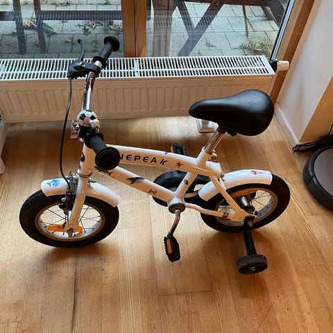 Pinepeak børnecykel med 12" hjul i sort. Cyklen er egnet til mindre børn og har kraftige dæk, pedaler og saddel tilpasset børnestørrelse. Velegnet til brug på både fortov og mindre stier afhængigt af barnets færdigheder.