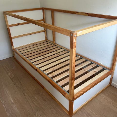 IKEA juniorseng i hvidmalet træ med lamelbund. Klassisk gavl i begge ender. Velegnet til mindre børn, der er vokset ud af tremmeseng. Der kan forekomme brugsspor, se billederne. Kapokmadras fra NSleep kan følge med gratis. Afhentes i Trekroner v Roskilde. Parfumefrit, dyrefrit og røgfrit hjem. Str. 77 x 167 cm