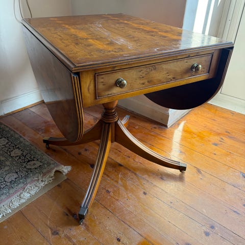 Spisebord i træ med klap og skuffe. Bordet står på fire slanke ben og har en udtræksklap, så bordpladen kan udvides fra en mindre, næsten trekantet form til en rund bordplade. Under bordpladen er der en skuffe med metalgreb. Velegnet som lille spisebord eller sidebord i stue, køkken eller entré.