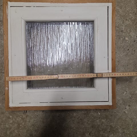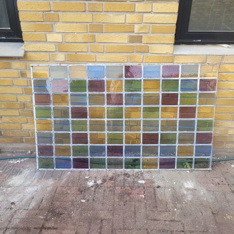 Farvet glasvindue med mange små rektangulære ruder i forskellige farver. Vinduespartiet er samlet i en metalramme og kan anvendes som vindue, skillevæg eller dekorativt element i byggeri eller indretning. Velegnet til projekter, hvor der ønskes lysindfald med farvet glas.