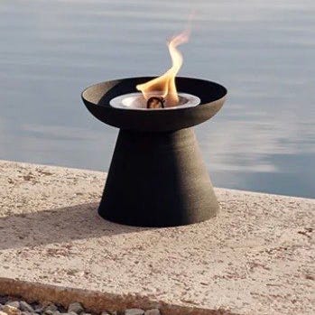 Audo Copenhagen Metra olielanterne i sort. Lanterne i skålformet design på kegleformet fod, velegnet til udendørs brug med olieindsats. Kan anvendes som stemningslys på terrasse, altan eller i haveområder. Designet giver en stabil base og åben skål til flammen, som kan kombineres med andre lanterner i samme serie for et ensartet udtryk.