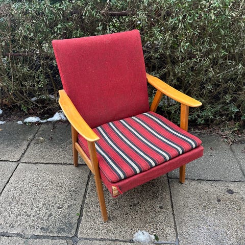 Skøn svensk lænestol fra 1970erne i fyrretræ med originalt betræk.