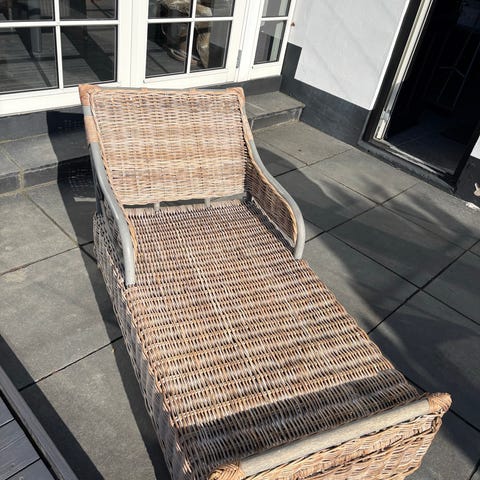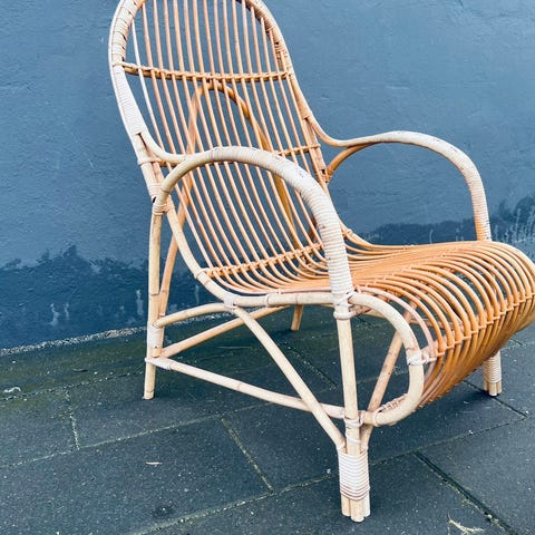 Lænestol med flettet sæde og ryglæn i naturfarvet materiale. Stel i lyst træ med skråtstillede ben og lav siddehøjde. Egnet som loungestol i stue, læsehjørne eller soveværelse.