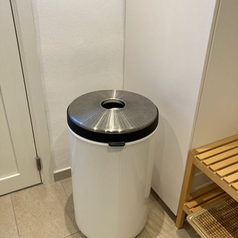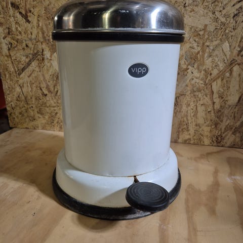 Vipp affaldsspand i turkis metal hvor farven er udgået med rundt design. Spanden har låg med centralt hul i rustfrit stål samt håndtag i metal i siden. Egnet til brug i køkken, bryggers eller kontor til opsamling af affald. Overfladen er glat og kan tørres af med en fugtig klud.