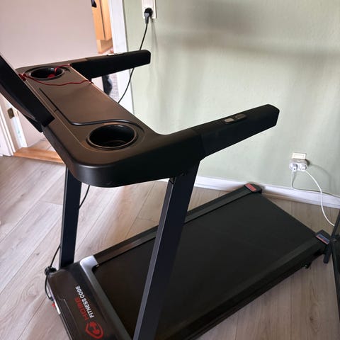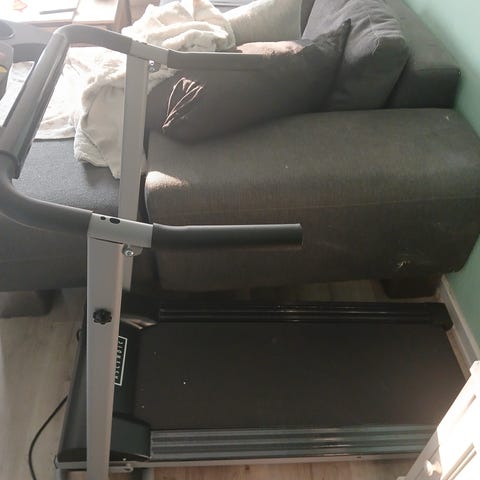 Vellafit løbebånd i sort. Kompakt model med håndtag foran og sikkerhedssnor. Egnet til indendørs gang- og løbetræning i hjemmet eller på kontoret. Simpelt betjeningshjul på fronten til styring af funktioner. Velegnet til én bruger ad gangen på et plant underlag.