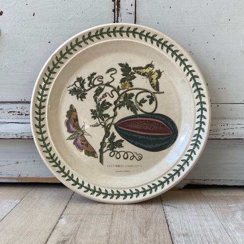 Vintage Portmeirion Botanic Garden “Cucurbita Citrullus" tallerken med motiv af en vandmelon omgivet af sommerfugle. Tallerkenen er designet af Susan Williams-Ellis i 1972. Tallerkenen er fremstillet i kraftig porcelæn og har den ikoniske grønne "blad-bort" kant.