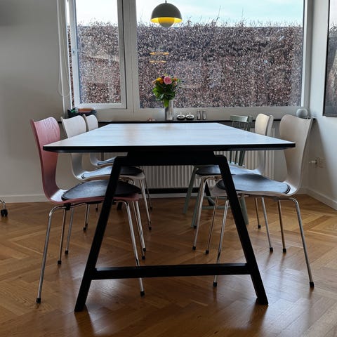 Så bordet kan blive 320 cm. langt. Bordpladen er nanolaminat