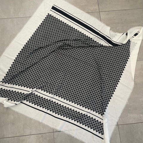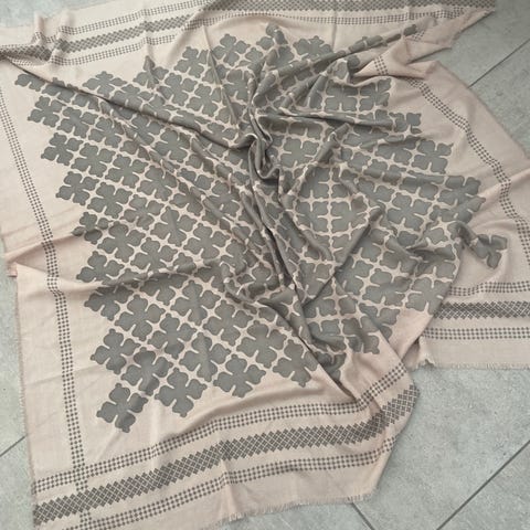 By Malene Birger tørklæde i uld i beige nuance. Tørklædet er one size og har et gennemgående mønster samt frynser i enderne. Velegnet som varmt halstørklæde eller som let sjal.