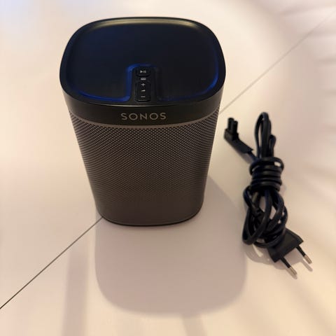 Sonos Play:1 trådløs højttaler i sort. Kompakt netværkshøjttaler til brug med Sonos-systemet. Højttaleren tilsluttes strøm og kan forbindes til hjemmenetværket via ethernet-porten på bagsiden eller trådløst gennem et eksisterende Sonos-setup. På toppen findes knapper til afspil/pause samt lydstyrkeregulering. Velegnet til brug i mindre rum, som del af et multiroom-setup eller som stereopar sammen med en anden Play:1.