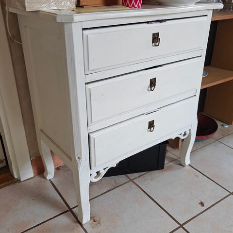 Flot og charmerende kommode i hvidmalet træ. Med 3 skuffer. Lige til at bruge.