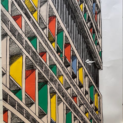 Le Corbusier Secret plakat med ramme. Kunstplakat med motiv i rosa, orange, sort og hvid med teksten "Le Corbusier Secret" og udstillingsinformation nederst. Plakaten er indrammet i en enkel, mørk ramme og egner sig til ophængning i stue, kontor eller andre opholdsrum.