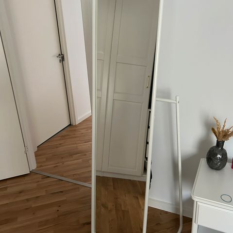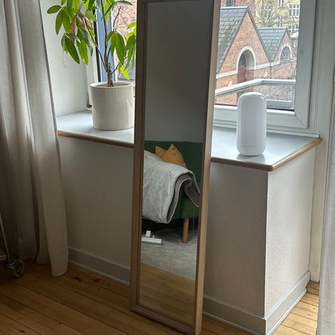 Freestanding full-length mirror from IKEA (KNAPPER model) with light wood frame and stand.
